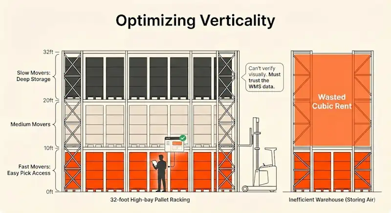 "Storing air" is a cardinal sin. If your building has 32-foot clear heights but you only use floor positions, you are wasting money. Getting product up high extends the life of a facility, but this requires precise inventory control. You must have a system you can trust, because quick visual checks are impossible at 30 feet.